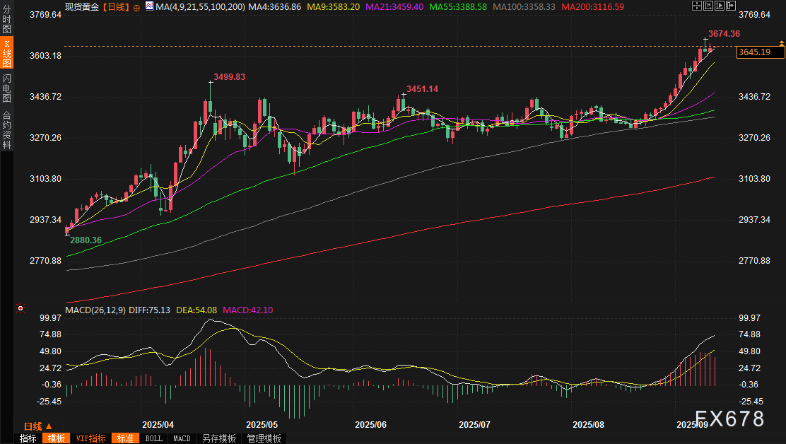 在全球经济不确定性笼罩之下,黄金作为传统避险资产再度闪耀光芒。在周二创下3674的历史新高后,现货黄金周三(9月10日)延续强势,收报3640.44美元/盎司,涨幅约0.4%,今年迄今涨幅已超过39%。这一轮金价上涨的背后,是美国PPI数据意外疲软、美联储降息预期进一步夯实,以及地缘政治紧张局势的持续发酵。这些因素交织成网,推动黄金市场进入新一轮牛市周期。投资者们正密切关注即将公布的CPI数据,这将进一步决定美联储的政策路径。周四(9月11日)亚市早盘,现货黄金震荡微涨,目前交投于3545美元/盎司附近。