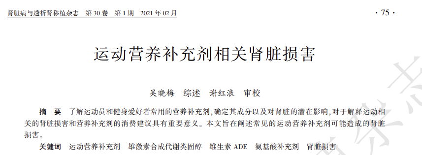 1.运动营养补充剂相关肾脏损害.肾脏病与透析肾移植杂志.