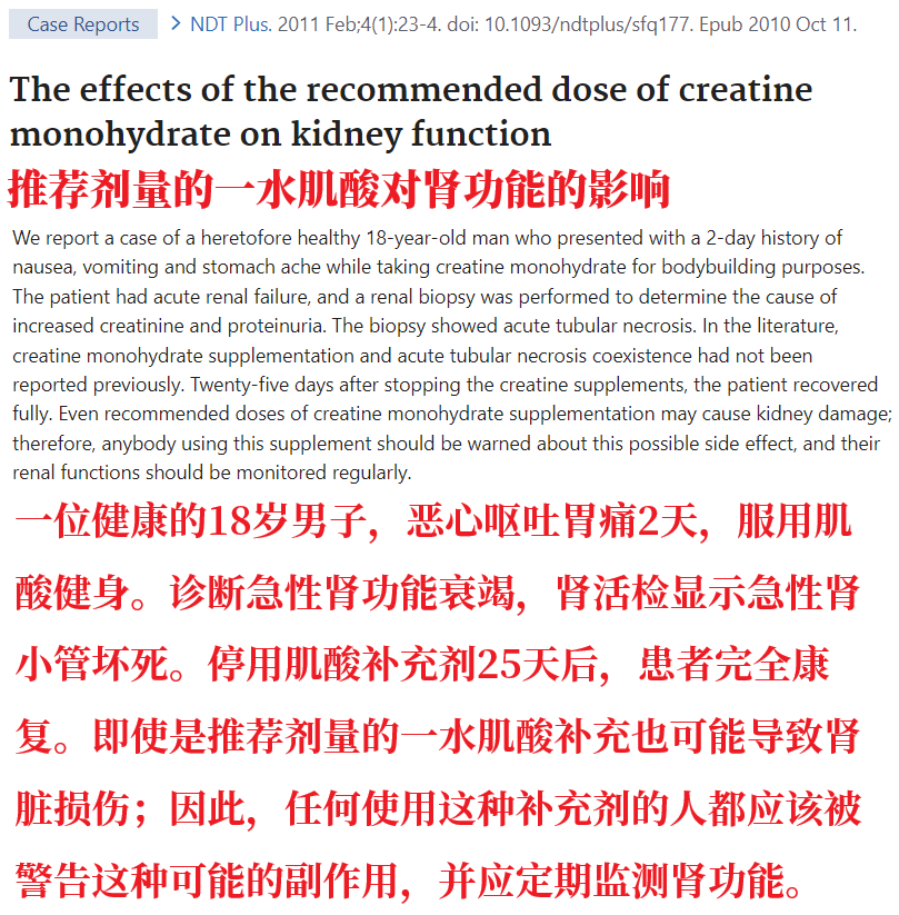 但是,仍然有补充肌酸的肾毒性报道,一位健康的18岁男性使用肌酸补充剂后,发生急性肾功能衰竭,肾活检显示肾小管坏死。