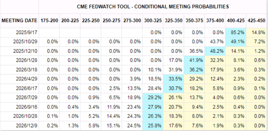 鲍威尔表示,目前就业下行风险增加(downside risks to employment are rising),而通胀上行的风险已经大幅减弱(Upside risks to inflation had diminished),可能需要调整政策立场(may warrant adjusting our policy stance),市场计价降息。