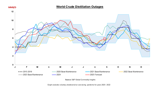 全球范围内来看,近期非计划性的在于俄罗斯炼油厂的遇袭(约147万桶日),其中季节性的检修占比更起主导作用。